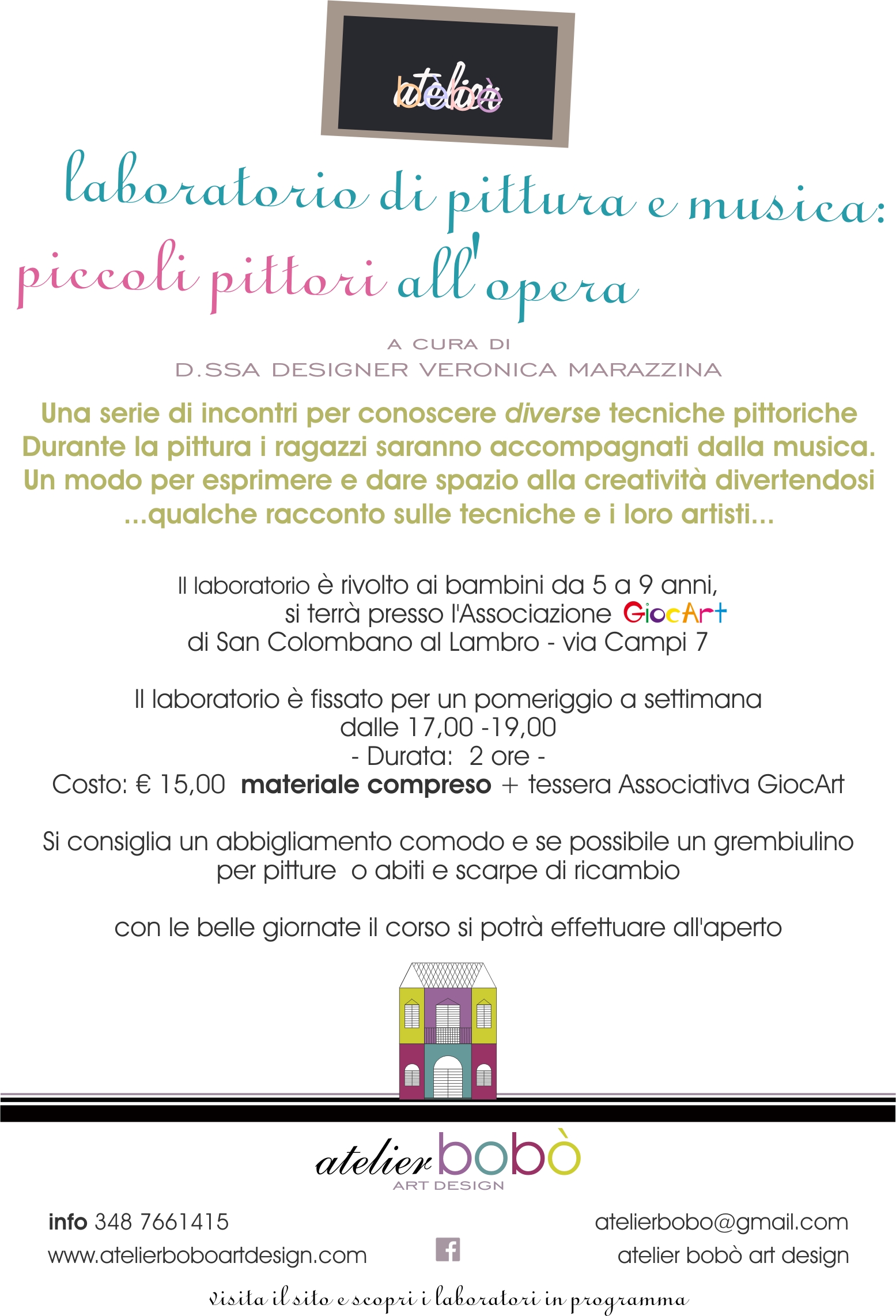 – Atelier bebè, Laboratori di pittura e musica per piccOli artisti (rivolti ai bambini dai 5 ai 10 anni).Una serie di incontri per acquisire attraverso tecniche pittoriche diverse e inusuali i mezzi per esprimere la propria creatività. Durante la pittura i ragazzi saranno seguiti dalla musica che a volte accompagnerà e altre stimolerà il loro gesto creativo. Un modo per esprimere e dare spazio alla immaginzione divertendosi…qualche racconto sulle tecniche e i loro artisti…
